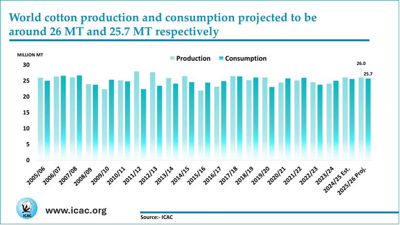 Σταθερές παραμένουν οι προβλέψεις για την παγκόσμια αγορά βαμβακιού κατά την περίοδο 2025/26, σύμφωνα με τα τελευταία στοιχεία της Διεθνούς Συμβουλευτικής Επιτροπής Βάμβακος (ICAC), τα οποία δόθηκαν στη δημοσιότητα στις αρχές Ιουνίου. Η παγκόσμια παραγωγή βαμβακιού αναμένεται να ανέλθει σε περίπου 26 εκατομμύρια τόνους, ενώ η κατανάλωση προβλέπεται να φθάσει τους 25,7 εκατομμύρια τόνους. Το παγκόσμιο εμπόριο παρουσιάζει τάσεις ανάκαμψης και εκτιμάται ότι θα αγγίξει τους 9,7 εκατομμύρια τόνους.