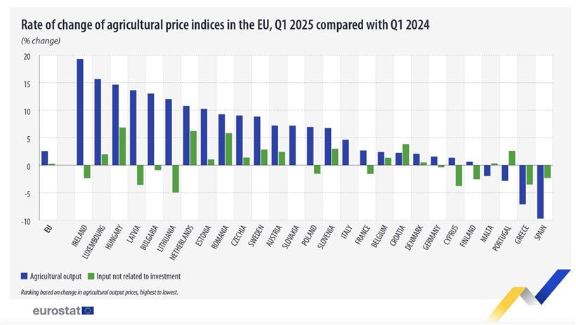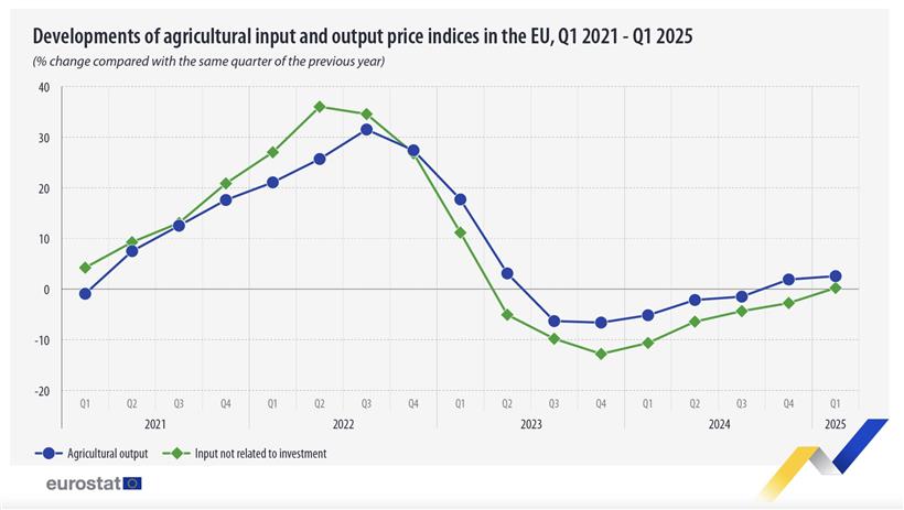 Το πρώτο τρίμηνο του 2025, η μέση τιμή της γεωργικής παραγωγής στην ΕΕ αυξήθηκε κατά 2,6%, σηματοδοτώντας το δεύτερο συνεχόμενο τρίμηνο αύξησης των τιμών, σύμφωνα με πρόσφατη έκθεση αγοράς της Eurostat.