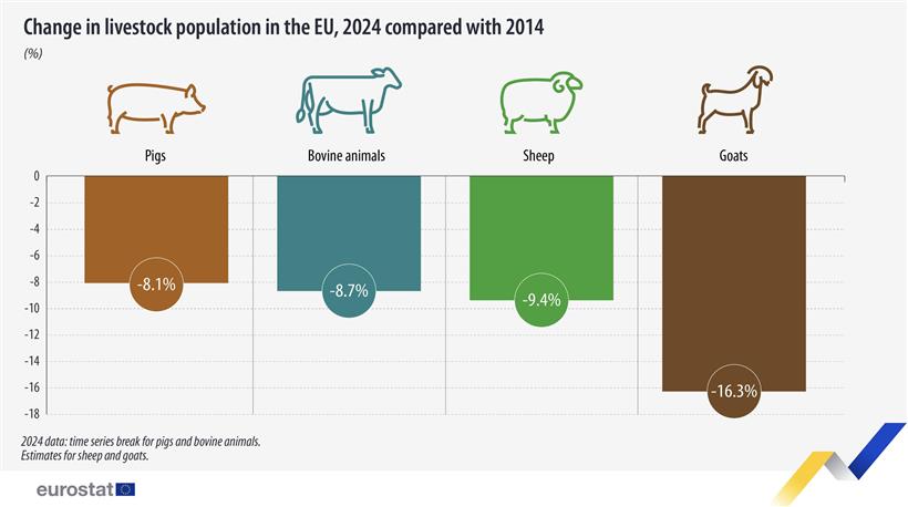 Οι πρόσφατες μειώσεις των ζωικών πληθυσμών ενίσχυσαν τη μακροπρόθεσμη τάση στην ΕΕ. Σε σύγκριση με το 2014, ο πληθυσμός των χοίρων το 2024 μειώθηκε κατά 8,1%, των βοοειδών κατά 8,7%, των προβάτων κατά 9,4% και των αιγών κατά 16,3%.