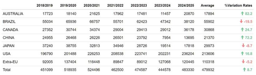 Μεταξύ Σεπτεμβρίου 2024 και Απριλίου 2025, οι εισαγωγές ελαιολάδου παγκοσμίως αυξήθηκαν κατά 8,7%, φθάνοντας σε όγκο 483.330 τόνων. Η αύξηση αυτή σημειώθηκε σε στρατηγικές αγορές όπως η Αυστραλία (82,2%) με 20.870 τόνους, η Κίνα (72,2%) με 13.695 τόνους, ο Καναδάς (24,7%) με 36.178 τόνους και οι ΗΠΑ (16,8%), οι οποίες εισήγαγαν 236.204 τόνους ελαιολάδου.