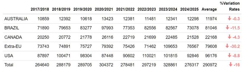 Μόνο στη Βραζιλία, την Ιαπωνία και το σύνολο των χωρών εκτός ΕΕ οι αγορές του προϊόντος αυτού μειώθηκαν κατά 19,5%, 8,7% και 5,2%, αντίστοιχα, καταγράφοντας όγκο αγορών 38.120 τόνων, 17.818 τόνων και 120.445 τόνων.