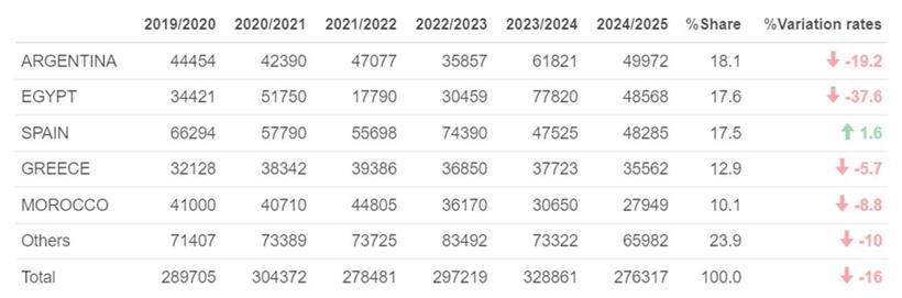 Ωστόσο, η Ισπανία έσπασε την τάση με αύξηση 1,6%, φτάνοντας τους 48.285 τόνους, γεγονός που της επιτρέπει να εδραιώσει την τρίτη θέση της συνολικά (μερίδιο 17,5%), πίσω από την Αργεντινή (18,1%) και την Αίγυπτο (17,6%) και μπροστά από την Ελλάδα (12,9%) και το Μαρόκο (10,1%).