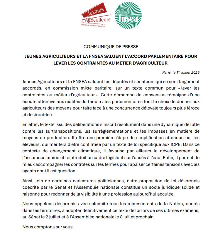 Την 1 Ιουλίου 2025, η Εθνική Ομοσπονδία Γεωργικών Συνδικάτων (FNSEA) και οι Νέοι Αγρότες (Jeunes Agriculteurs) εξέδωσαν κοινή ανακοίνωση, με την οποία χαιρετίζουν τη συμφωνία που επιτεύχθηκε στην Μικτή Κοινοβουλευτική Επιτροπή μεταξύ βουλευτών και γερουσιαστών, επί ενός ενιαίου νομοσχεδίου για την «άρση των περιορισμών στο επάγγελμα του αγρότη».