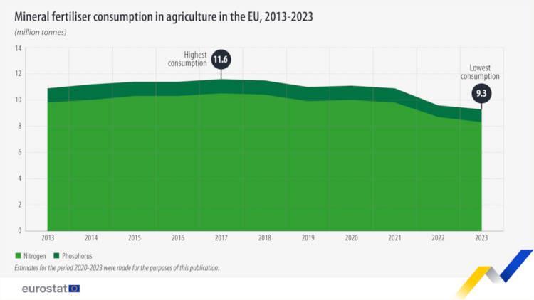 Η κατανάλωση λιπασμάτων από άζωτο και φώσφορο στη γεωργία της Ευρωπαϊκής Ένωσης έφτασε τους 9.3 εκατ. τόνους το 2023, σύμφωνα με τα τελευταία στοιχεία που δημοσίευσε η Eurostat.
