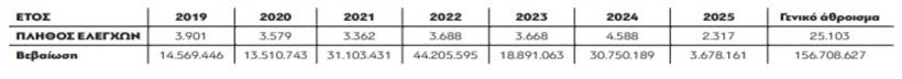Επιπλέον, με σκοπό να ενισχύσει το ψηφιακό της οπλοστάσιο, στη μάχη κατά της φοροδιαφυγής στον τομέα των αγροτικών προϊόντων, έχει αναπτύξει ψηφιακά εργαλεία για την αύξηση της αποτελεσματικότητας των φορολογικών ελέγχων, όπως το ψηφιακό δελτίο αποστολής. Επιπλέον, η ΑΑΔΕ πραγματοποίησε μέσω του ελεγκτικού μηχανισμού, κατά τα φορολογικά έτη 2019 έως 2025, δράσεις και ελέγχους σε περισσότερες από 45.000 περιπτώσεις αγροτικών επιχειρήσεων, με τα αποτελέσματα να είναι τα ακόλουθα: