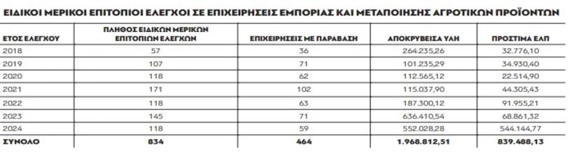 Κατά το 2024 διενεργήθηκαν 885 έλεγχοι σε αγρότες (καλλιέργειες πολυετείς και μη, ζωική παραγωγή) με μέση παραβατικότητα 38,35%.