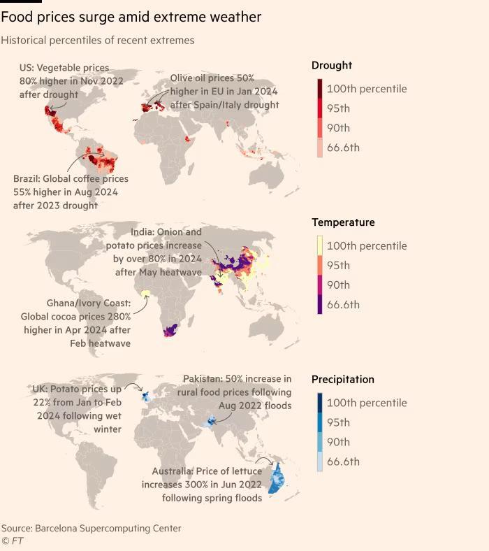 Η μελέτη διαπίστωσε ότι οι αυξήσεις των τιμών των τροφίμων συχνά ακολουθούσαν ακραία καιρικά φαινόμενα μόλις λίγους μήνες μετά — ένα μοτίβο που, όπως προειδοποίησαν οι ερευνητές, είναι πιθανό να γίνει πιο συνηθισμένο καθώς η κλιματική αλλαγή εντείνεται.