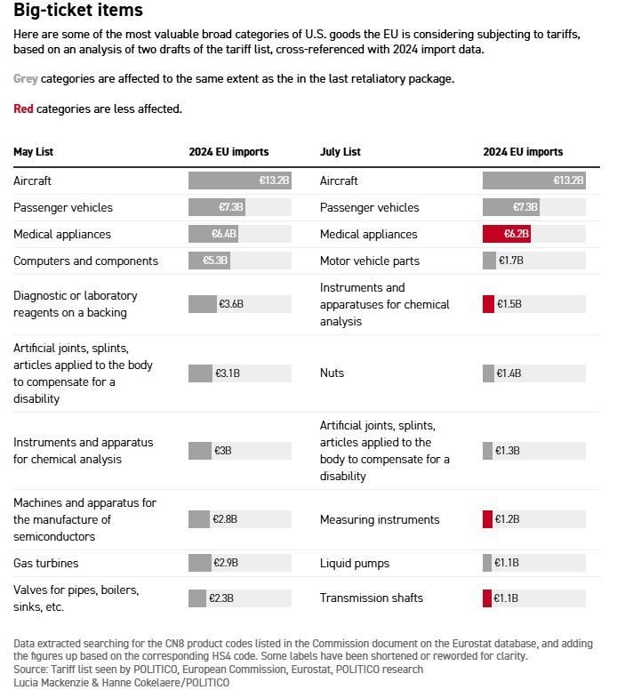 Έχοντας ήδη συμφωνήσει σε ένα αρχικό πακέτο δασμών που αφορά αμερικανικά προϊόντα αξίας περίπου 21 δισ. ευρώ, το οποίο θα τεθεί σε ισχύ στις 6 Αυγούστου, η ΕΕ διαπραγματεύεται εδώ και μήνες τις λεπτομέρειες ενός δεύτερου πακέτου αντιποίνων.