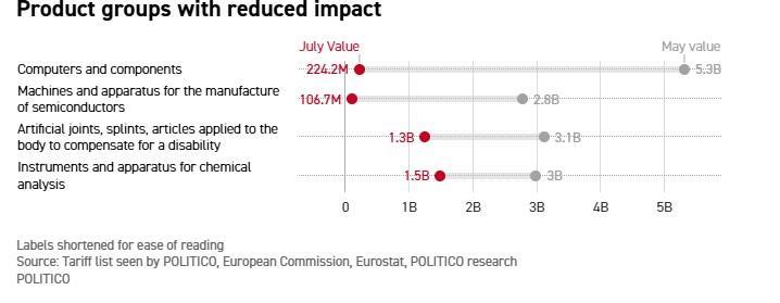 Τα διαγνωστικά ή εργαστηριακά αντιδραστήρια — δηλαδή, χημικά που χρησιμοποιούνται για ιατρικές εξετάσεις — και οι αεριοστρόβιλοι ήταν μεταξύ των 10 προϊόντων που επλήγησαν περισσότερο στην πρώτη έκδοση του δασμολογικού πίνακα. Έχουν διαγραφεί από την τελευταία έκδοση που είδε το POLITICO.