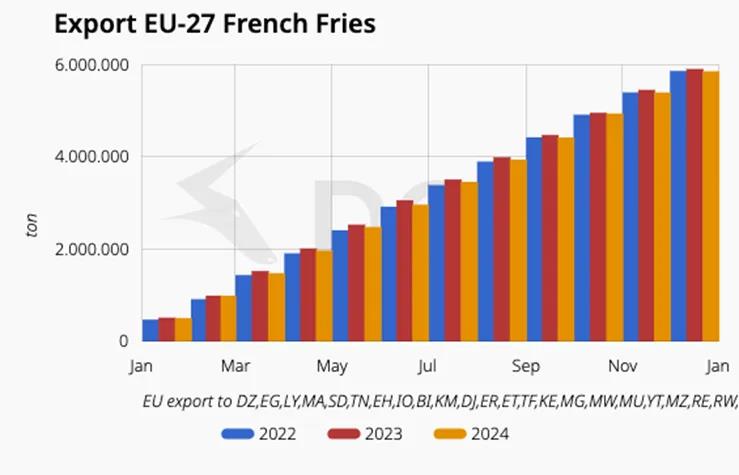 Η ευρωπαϊκή βιομηχανία τηγανιτών πατατών βρίσκεται σε δύσκολη θέση. Τα στοιχεία εξαγωγών παρουσιάζουν μικτή εικόνα: η παγκόσμια ζήτηση για τηγανιτές πατάτες εξακολουθεί να αυξάνεται πάνω από 4%, αλλά η Ευρώπη χάνει έδαφος σε βασικές εξαγωγικές αγορές. Ενώ η Γαλλία παρουσίασε ισχυρή ανάπτυξη (+30%), το Βέλγιο (-6,6%) και η Γερμανία (σταθερά) σημείωσαν πτώση στους όγκους. Οι Κάτω Χώρες πέτυχαν μόνο μια μέτρια αύξηση 3,6%, παρά την επέκταση της μεταποιητικής ικανότητας.
