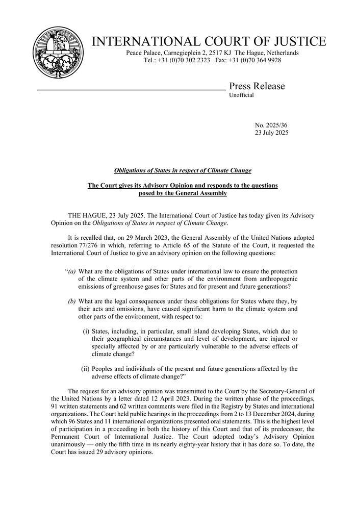 Στις 23 Ιουλίου 2025, το Διεθνές Δικαστήριο της Χάγης (ICJ) εξέδωσε μια γνωμοδότηση-σταθμό που αλλάζει τα δεδομένα στη νομική θεμελίωση της ευθύνης των κρατών για την κλιματική αλλαγή. Για πρώτη φορά, η ανώτατη δικαστική αρχή του ΟΗΕ διατύπωσε με σαφήνεια ότι τα κράτη φέρουν νομική υποχρέωση να προστατεύουν το κλίμα από ανθρωπογενείς εκπομπές αερίων του θερμοκηπίου, βάσει δεσμευτικού διεθνούς και εθιμικού δικαίου.