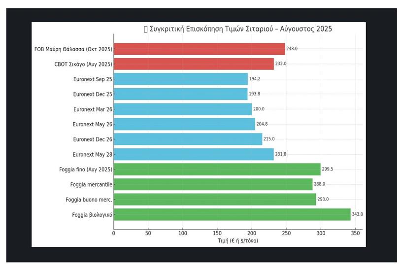 Στην Ιταλία, η αγορά της Foggia, που λειτουργεί ως σημείο αναφοράς για το σκληρό σιτάρι στην ΕΕ, εμφανίζει σταθερότητα. Οι τελευταίες καταγραφές δείχνουν durum fino στα 299,5 €/τόνο, buono mercantile στα 293 €/τόνο, mercantile στα 288 €/τόνο και βιολογικό για τρόφιμα στα 343 €/τόνο. Η εικόνα αυτή, παρά τις διακυμάνσεις στην παραγωγή της Απουλίας, δείχνει μια αγορά με σαφή τιμολογιακή καθοδήγηση, σε αντίθεση με την ελληνική πραγματικότητα. Στην Ελλάδα, οι παραγωγοί συχνά δεν γνωρίζουν με ακρίβεια την αξία της σοδειάς τους. Οι τιμές διαμορφώνονται αποσπασματικά, με καθυστερήσεις, χωρίς πρόσβαση σε διαφανείς μηχανισμούς πληροφόρησης ή σε εργαλεία αντιστάθμισης κινδύνου.