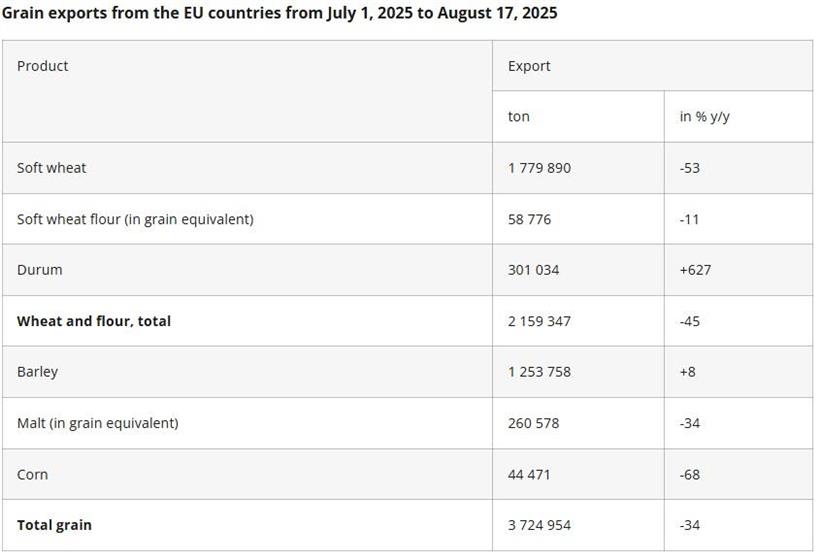Στις πρώτες επτά εβδομάδες της τρέχουσας περιόδου, η οποία ξεκίνησε την 1η Ιουλίου 2025, οι χώρες της ΕΕ εξήγαγαν 3.730 χιλιάδες τόνους σιτηρών και μεταποιημένων προϊόντων, δηλαδή 34% λιγότερο από ό,τι την ίδια περίοδο της περιόδου 2024/2025. Αυτό αναφέρθηκε από το πρακτορείο Zerno On-Line με αναφορά στην Ευρωπαϊκή Επιτροπή.