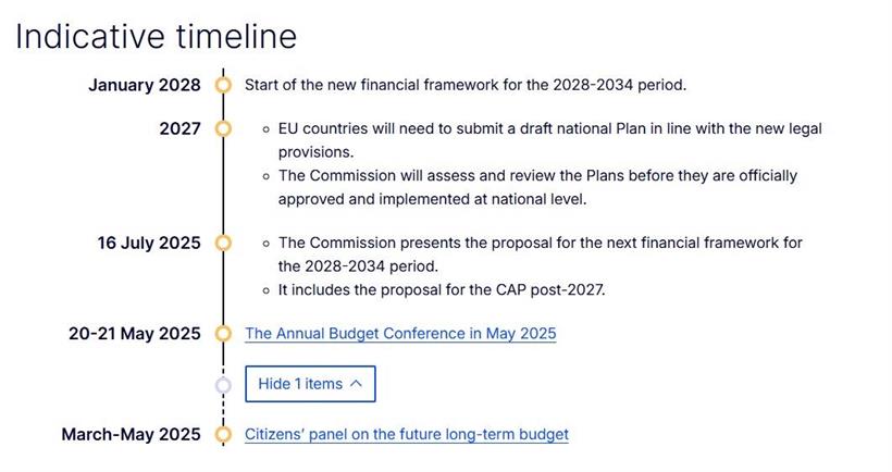 Σε ό,τι αφορά τον χρονικό ορίζοντα, το 2027 θα αποτελέσει κομβικό έτος, καθώς τα κράτη-μέλη καλούνται να υποβάλουν τα νέα Εθνικά Στρατηγικά Σχέδια σε εναρμόνιση με το αναθεωρημένο νομικό πλαίσιο. Η Ευρωπαϊκή Επιτροπή θα αξιολογήσει τις εθνικές προτάσεις, πριν εγκρίνει τη θέση τους στο νέο πολυετές δημοσιονομικό πλαίσιο 2028–2034, το οποίο θα περιλαμβάνει και τον πυρήνα της ΚΑΠ μετά το 2027. Ο διάλογος αυτός δεν περιορίζεται στην αγροτική παραγωγή, αλλά διαπερνά συνολικά τις ευρωπαϊκές πολιτικές συνοχής, βιωσιμότητας και κοινωνικής ευημερίας.