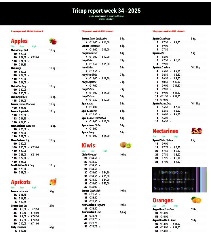 Η παρουσία ακτινιδίων Hayward στην ολλανδική αγορά, όπως καταγράφεται για δεύτερη συνεχόμενη εβδομάδα στο δελτίο τιμών της 34ης εβδομάδας από το Tricop.nl, επαναφέρει στο προσκήνιο το ζήτημα της διαχείρισης της εμπορίας νωπών φρούτων εκτός της επίσημης περιόδου συγκομιδής. Σύμφωνα με τις σχετικές εγγραφές, προϊόντα της συγκεκριμένης ποικιλίας προσφέρονται στην αγορά της Ουτρέχτης σε τιμές που κυμαίνονται μεταξύ €26,50 και €34,50 ανά 10κιλο, ενώ δηλώνεται ως χώρα προέλευσης η Χιλή και η Νέα Ζηλανδία.