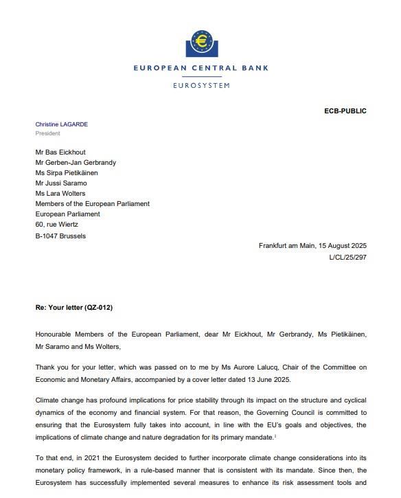 Σε επιστολή της με ημερομηνία 15 Αυγούστου 2025, η οποία απευθύνεται σε πέντε ευρωβουλευτές που δραστηριοποιούνται στα πεδία της βιωσιμότητας και των οικονομικών, η Λαγκάρντ σημειώνει πως οι προτεινόμενες αλλαγές στις υποχρεώσεις βιώσιμης αναφοράς των επιχειρήσεων περιορίζουν κρίσιμα τη διαθεσιμότητα ποιοτικών δεδομένων, γεγονός που υπονομεύει την ικανότητα του Ευρωσυστήματος να αξιολογεί τους κλιματικούς κινδύνους με επαρκή ακρίβεια.