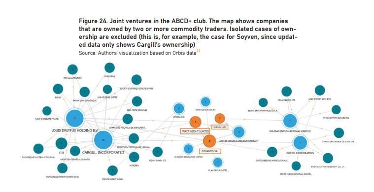Στο επίκεντρο της μελέτης βρίσκονται οι μεγαλύτεροι παγκόσμιοι έμποροι γεωργικών προϊόντων, οι λεγόμενες ABCD+ εταιρείες (ADM, Bunge, Cargill, Louis Dreyfus, και άλλοι περιφερειακοί δρώντες όπως η Olam και η Wilmar). Το κύριο εύρημα είναι ότι οι εταιρείες αυτές δεν δραστηριοποιούνται μόνο ως παραδοσιακοί ενδιάμεσοι στην εμπορία σιτηρών, αλλά συγκροτούν ένα οικοσυστημικό σχήμα ελέγχου, το οποίο διαπερνά τις αλυσίδες αξίας από το χωράφι έως τις χρηματοπιστωτικές αγορές και τις ψηφιακές πλατφόρμες εμπορίου.