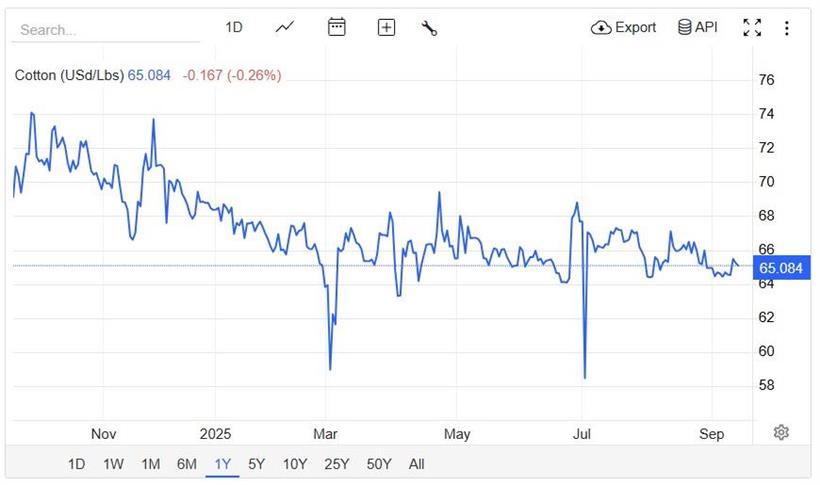 Στο διεθνές πεδίο, η εικόνα δεν είναι πιο ενθαρρυντική. Ο δείκτης ICE Futures (ΗΠΑ, No. 2) κινείται στα 65,49 σεντς/λίβρα, με άλλα συμβόλαια γύρω από τα 67–67,60 σεντς/λίβρα. Το USDA προβλέπει μείωση της παγκόσμιας παραγωγής κατά περίπου 2,5 εκατ. μπάλες, την περίοδο 2025/26, με τη ζήτηση να παραμένει σταθερή. Παρά τη μείωση των αποθεμάτων, οι γεωπολιτικοί κίνδυνοι και οι εμπορικοί δασμοί συντηρούν ένα περιβάλλον αβεβαιότητας.