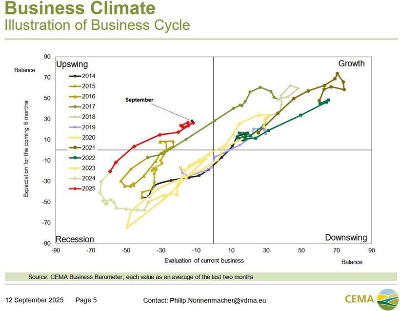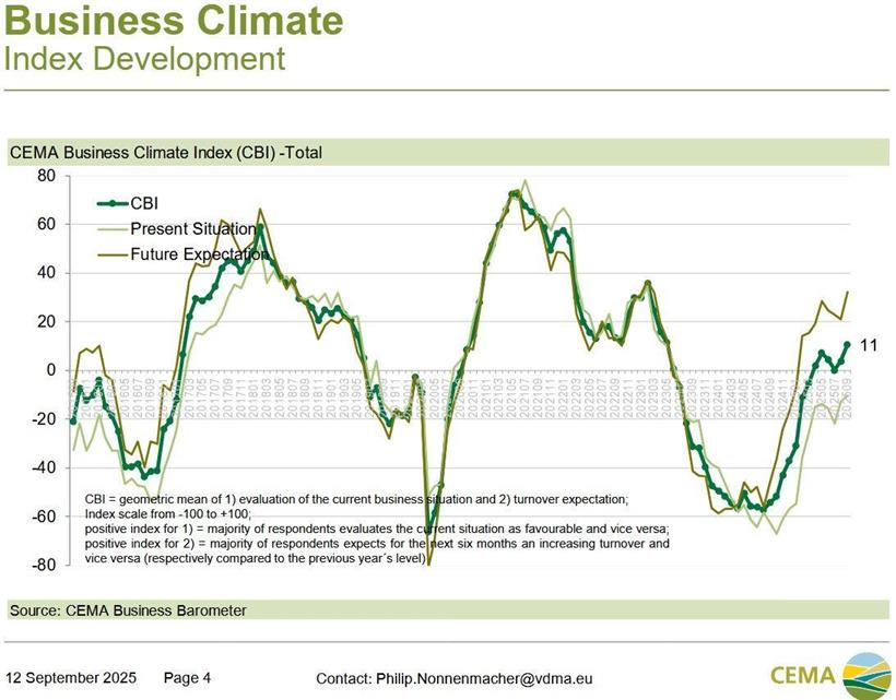 Ο ευρωπαϊκός κλάδος γεωργικών μηχανημάτων φαίνεται να επιστρέφει σταδιακά σε τροχιά ανάκαμψης, σύμφωνα με τον δείκτη επιχειρηματικού κλίματος (CBI) του CEMA για τον Σεπτέμβριο 2025. Ο δείκτης καταγράφει άνοδο από τους +4 στους +11 βαθμούς, συνεχίζοντας μια ανοδική πορεία που είχε ξεκινήσει στα τέλη του 2024 και είχε προσωρινά ανακοπεί τους θερινούς μήνες.