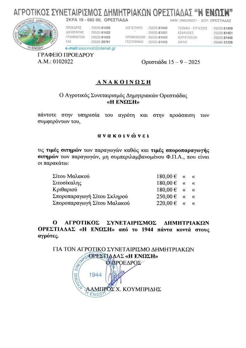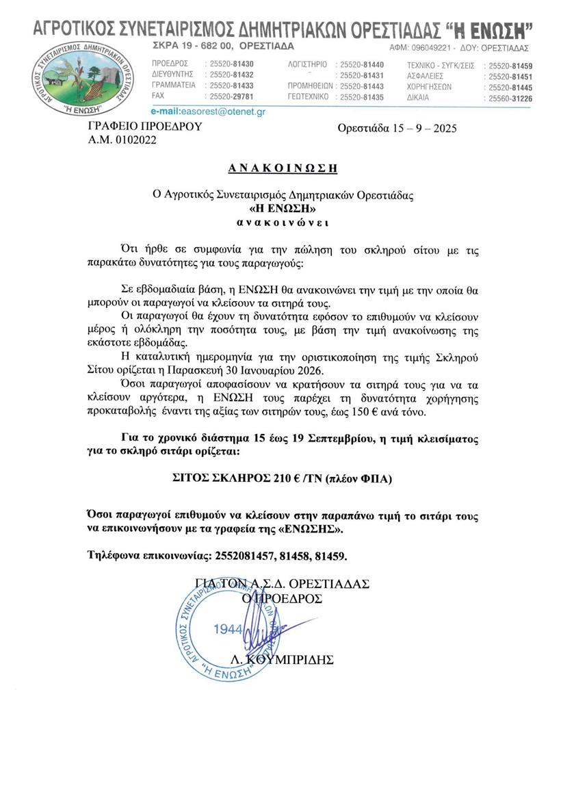 Με επίσημες ανακοινώσεις του στις 15 Σεπτεμβρίου 2025, ο Αγροτικός Συνεταιρισμός Δημητριακών Ορεστιάδας «Η ΕΝΩΣΗ» γνωστοποίησε τις τιμές αγοράς για σιτηρά και σποροπαραγωγή, καθώς και το πλαίσιο εβδομαδιαίας τιμολόγησης και κλεισίματος για τη διάθεση σκληρού σίτου από τους παραγωγούς.