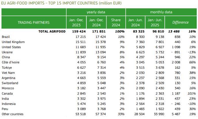 Σημειώνεται ότι συνολικά, οι εισαγωγές γεωργικών προϊόντων στην ΕΕ τον Ιανουάριο-Ιούλιο του τρέχοντος έτους ανήλθαν σε 96,8 δισεκατομμύρια δολάρια (+16%). Οι γεωργικές εξαγωγές από την ένωση για την περίοδο αυτή ανήλθαν σε 118,7 δισεκατομμύρια δολάρια (+2%), εκ των οποίων 2,1 δισεκατομμύρια δολάρια (+17%) προορίζονταν για την Ουκρανία.