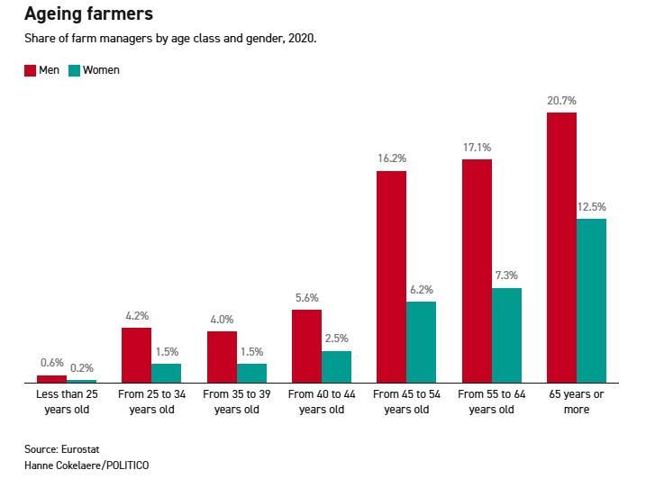 Περισσότεροι από το ένα τρίτο των διαχειριστών αγροκτημάτων στην Ευρώπη είναι άνω των 65 ετών, ενώ λιγότεροι από ένας στους οκτώ είναι κάτω των 40.