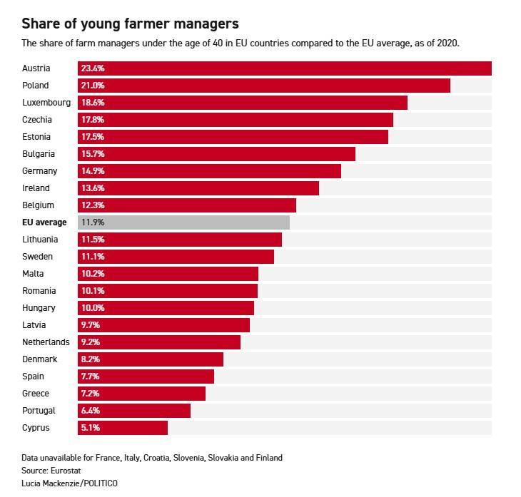 Τώρα, ο Επίτροπος Γεωργίας Κρίστοφ Χάνσεν θέλει να ανεβάσει τον πήχη. Σύμφωνα με προσχέδιο της στρατηγικής που εξασφάλισε το POLITICO, ο στόχος είναι να διπλασιαστεί το ποσοστό των Ευρωπαίων αγροτών κάτω των 40 ετών ώστε να φτάσει σχεδόν στο 25% έως το 2040.