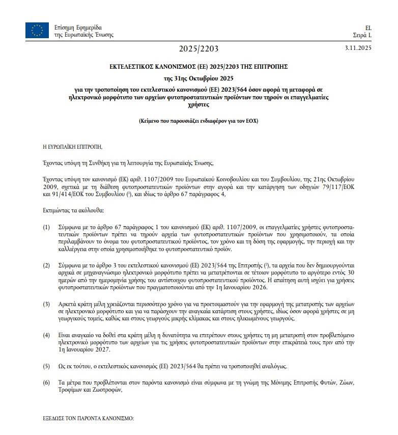 ΕΚΤΕΛΕΣΤΙΚΟΣ ΚΑΝΟΝΙΣΜΟΣ (ΕΕ) 2025/2203 ΤΗΣ ΕΠΙΤΡΟΠΗΣ , που εκδόθηκε στις 31 Οκτωβρίου 2025, η Ευρωπαϊκή Επιτροπή τροποποιεί το ισχύον πλαίσιο για τα αρχεία φυτοπροστατευτικών προϊόντων, θεσπίζοντας τη μεταφορά τους σε ηλεκτρονική μορφή και προβλέποντας παράταση εφαρμογής έως το 2027 για τους επαγγελματίες χρήστες- αγρότες.