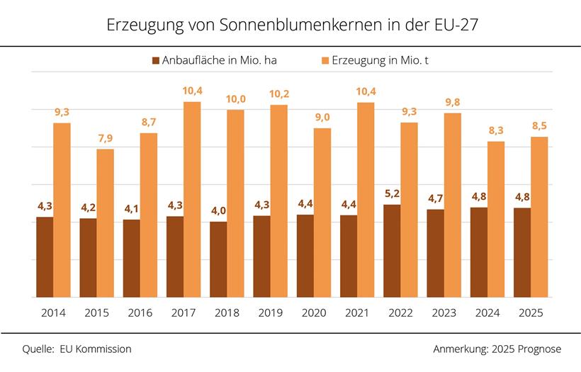 Σύμφωνα με την UFOP, η Ευρωπαϊκή Επιτροπή εκτιμά ότι η ΕΕ θα παράγει περίπου 8,5 εκατομμύρια τόνους ηλιόσπορων το 2025. Αυτό αντιπροσωπεύει αύξηση σχεδόν 3% σε σχέση με το απογοητευτικό 2024. Η αυξημένη απόδοση αντιστάθμισε εν μέρει τη μικρή μείωση της καλλιεργούμενης έκτασης στην ΕΕ.
