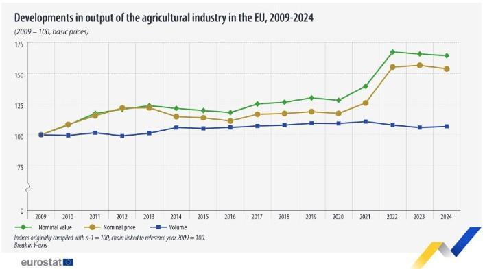 Το 2024, η γεωργική παραγωγή της Ευρωπαϊκής Ένωσης (ΕΕ) εκτιμήθηκε σε 531,9 δισεκατομμύρια ευρώ σε βασικές τιμές, σημειώνοντας μείωση 0,9 % σε σχέση με το 2023 (536,7 δισεκατομμύρια ευρώ). Αυτό ήταν το δεύτερο συνεχές έτος μικρής μείωσης της αξίας από το υψηλότερο επίπεδο που είχε επιτευχθεί το 2022. Η μεταβολή αυτή στην ονομαστική αξία αντανακλούσε την ισορροπία μεταξύ μιας μικρής αύξησης του όγκου της παραγωγής (+1 %) και μιας πτώσης της ονομαστικής τιμής των γεωργικών προϊόντων και υπηρεσιών (-1,8 %).