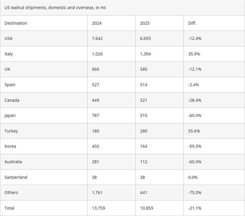 Η συντριπτική πλειονότητα των προμηθειών προήλθε από τις ΗΠΑ – 54,45 χιλιάδες τόνοι, ή 47% των συνολικών εισαγωγών. Η ΕΕ αύξησε επίσης σημαντικά τις αγορές από την Κίνα, κατά 3,7 φορές, φτάνοντας τους 24,14 χιλιάδες τόνους. Με αυτόν τον τρόπο, η Κίνα ξεπέρασε φέτος τη Χιλή και την Ουκρανία όσον αφορά τις προμήθειες καρυδιών στην Ευρώπη.