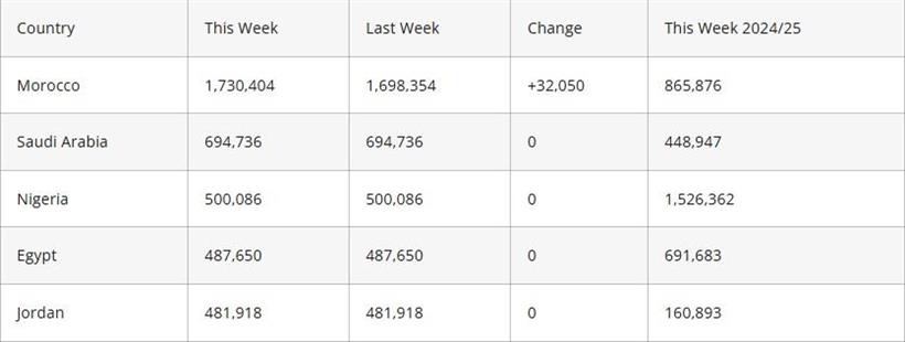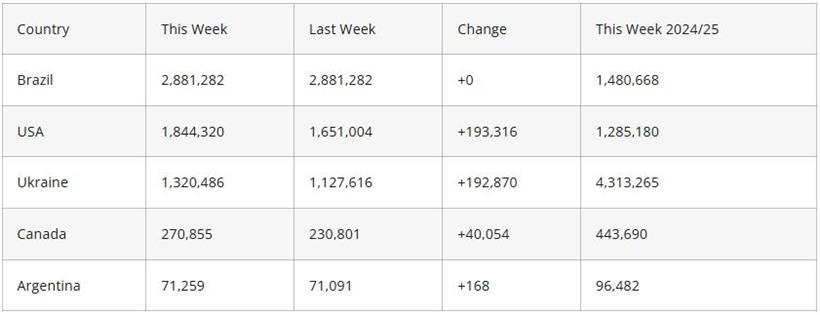 Η ανάκτηση ορισμένων γαλλικών δεδομένων είχε οδηγήσει στο να μειωθεί η υστέρηση που εμφάνιζαν οι αναφερόμενες εξαγωγές μαλακού σιταριού της ΕΕ για το 2025/26 σε σχέση με τα περυσινά στοιχεία, με το σύνολο να εξισώνεται με το επίπεδο του προηγούμενου έτους στην περσινή έκθεση.