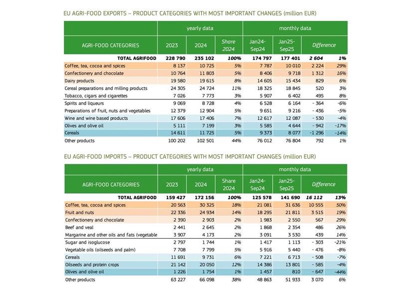 Αυτή η εξέλιξη έρχεται σε αντίθεση με τη δυναμική άλλων κατηγοριών, όπως ο καφές, το τσάι, το κακάο και τα μπαχαρικά, που σημείωσαν τη μεγαλύτερη αύξηση σε ετήσια βάση, 50%, ωθούμενες από την αύξηση των τιμών του καφέ, 51% περισσότερο, και των κόκκων κακάου, 76% περισσότερο. Αυτά τα στοιχεία, αν και καταδεικνύουν τη δύναμη των διεθνών αγορών του ευρωπαϊκού ελαιόλαδου σε όγκο, επιβεβαιώνουν ότι υφίσταται μείωση του κύκλου εργασιών λόγω της πτώσης των τιμών.