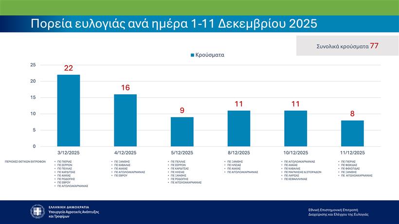 Για το διάστημα 1–11 Δεκεμβρίου 2025 καταγράφονται 77 επιβεβαιωμένα κρούσματα σε 95 εκτροφές.