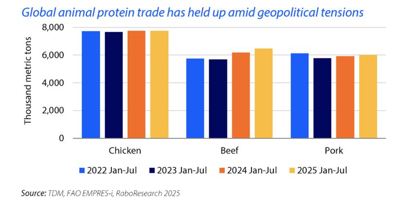 Παρά τις αναταράξεις, το παγκόσμιο εμπόριο ζωικών πρωτεϊνών εμφανίζει ανθεκτικότητα. Στρατηγικές κινήσεις, όπως η προώθηση αποστολών βοδινού από τη Βραζιλία προς τις ΗΠΑ, συνέβαλαν στη διατήρηση των όγκων, παρά τη μεταβλητότητα και τις μεταβαλλόμενες δασμολογικές πολιτικές που αναδιαμορφώνουν τις εμπορικές ροές. Ωστόσο, οι ανισορροπίες προσφοράς και ζήτησης συνεχίζουν να αναζητούν σημείο ισορροπίας, τάση που εκτιμάται ότι θα παραμείνει και το 2026, υπό την επίδραση γεωπολιτικών εντάσεων και εξελισσόμενων πολιτικών.