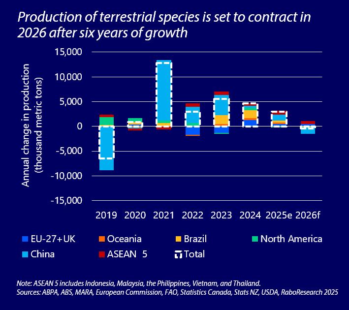 Επιβράδυνση της ανάπτυξης της παγκόσμιας παραγωγής ζωικών πρωτεϊνών αναμένεται το 2026, σύμφωνα με έκθεση της RaboResearch, καθώς ο κλάδος επηρεάζεται τόσο από κυκλικούς όσο και από διαρθρωτικούς παράγοντες. Τα θαλασσινά και τα πουλερικά προβλέπεται να αποτελέσουν τους βασικούς μοχλούς ανάπτυξης, την ώρα που η παραγωγή χοιρινού και βοδινού κρέατος αναμένεται να συρρικνωθεί. Πρόκειται για την πρώτη μείωση της παγκόσμιας παραγωγής χερσαίων ζωικών ειδών τα τελευταία έξι χρόνια.