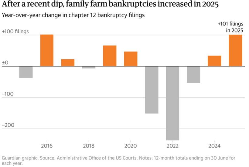 Οι εκτιμήσεις κάνουν λόγο για περισσότερες από 1.000 χρεοκοπίες αγροκτημάτων φέτος, με το Αρκάνσας να πλήττεται περισσότερο. Παρότι οι αριθμοί παραμένουν χαμηλότεροι από τα επίπεδα της αγροτικής κρίσης της δεκαετίας του 1980, οι αναλυτές προειδοποιούν ότι χωρίς ουσιαστική βελτίωση στο εμπόριο και τη ζήτηση, οι πιέσεις στον αγροτικό τομέα θα συνεχιστούν και το 2026.