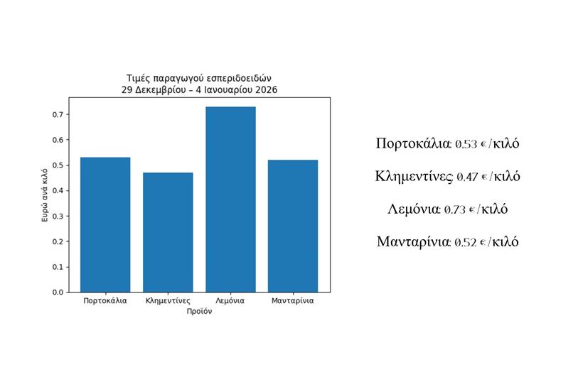 Το πέρασμα από το 2025 στο 2026 βρίσκει την αγορά των εσπεριδοειδών σε μια φάση σχετικής ηρεμίας. Οι μεταβολές δεν είναι εντυπωσιακές αλλά αποκαλυπτικές για όσους διαβάζουν προσεκτικά τα μεγέθη. Τα δεδομένα της περιόδου 29 Δεκεμβρίου έως 4 Ιανουαρίου 2026 δείχνουν ότι οι τιμές παραγωγού κινούνται μέσα σε στενά όρια, με το πραγματικό βάρος να μετατοπίζεται στη σύγκριση με το προηγούμενο έτος και όχι στις εβδομαδιαίες διακυμάνσεις.