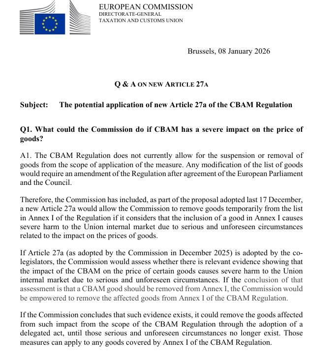 Στον πυρήνα της αναταραχής βρίσκεται η πρόταση της Ευρωπαϊκής Επιτροπής του Δεκεμβρίου 2025 για την εισαγωγή του νέου Άρθρου 27a στον κανονισμό του CBAM. Το άρθρο αυτό προβλέπει τη δυνατότητα προσωρινής εξαίρεσης προϊόντων από το πεδίο εφαρμογής του μηχανισμού, όταν προκύπτουν «σοβαρές και απρόβλεπτες συνθήκες» που προκαλούν σημαντική ζημία στην εσωτερική αγορά. Το κρίσιμο στοιχείο, όπως αποσαφηνίζεται στο επίσημο έγγραφο ερωτήσεων και απαντήσεων της Επιτροπής, είναι ότι η εξαίρεση αυτή μπορεί να εφαρμοστεί και αναδρομικά, από το χρονικό σημείο κατά το οποίο η Επιτροπή κρίνει ότι πληρούνται οι σχετικές προϋποθέσεις