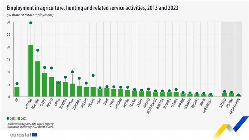 Παρά τις επιμέρους αυξήσεις σε ορισμένα κράτη-μέλη, η Eurostat επισημαίνει ότι η αναλογία της αγροτικής απασχόλησης στο σύνολο της εργασίας μειώθηκε σε όλες τις χώρες της Ένωσης. Τις μεγαλύτερες πτώσεις κατέγραψαν η Ρουμανία (-8,9%), καθώς και η Κροατία και η Πορτογαλία (-4,7%).