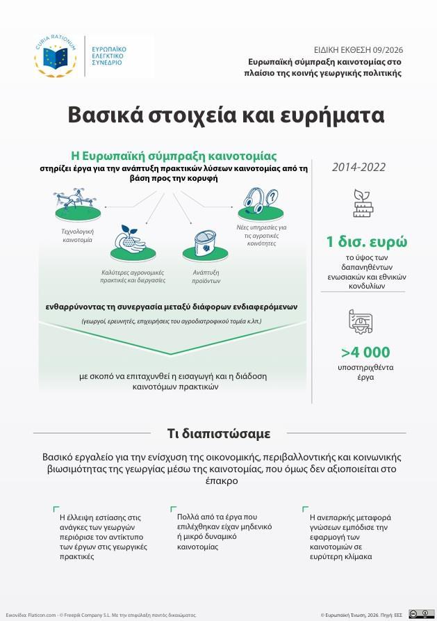 Η Ειδική Έκθεση 09/2026 του Ευρωπαϊκού Ελεγκτικού Συνεδρίου καταγράφει με σαφήνεια ότι η Ευρωπαϊκή Σύμπραξη Καινοτομίας για την παραγωγικότητα και τη βιωσιμότητα της γεωργίας, η γνωστή EIP AGRI, λειτούργησε ως βασικό εργαλείο της Κοινής Αγροτικής Πολιτικής, αλλά δεν αξιοποιήθηκε στο έπακρο.