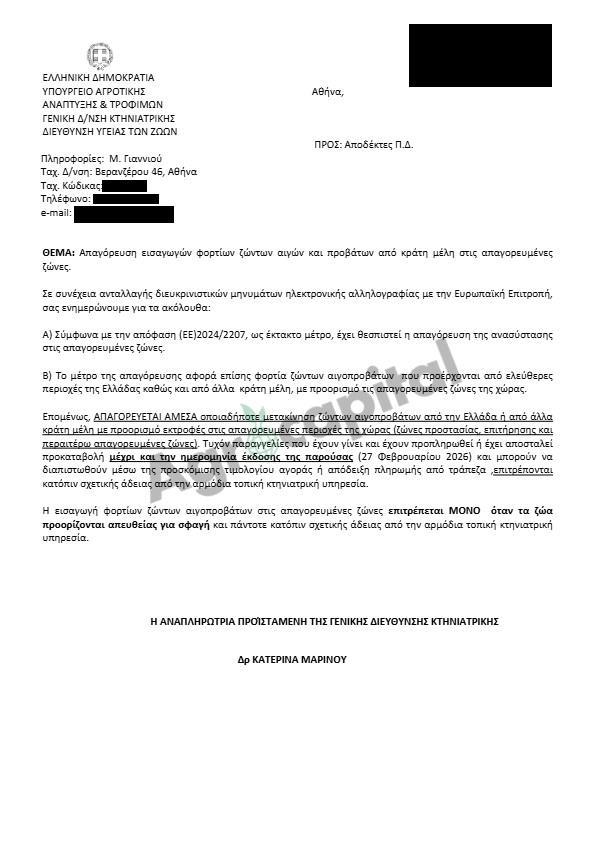 Απαγορεύεται άμεσα οποιαδήποτε μετακίνηση ζώντων αιγοπροβάτων από την Ελλάδα ή από άλλα κράτη μέλη με προορισμό εκτροφές εντός ζωνών προστασίας, επιτήρησης και περαιτέρω απαγορευμένων περιοχών, όπως ρητά αναφέρεται στο έγγραφο.