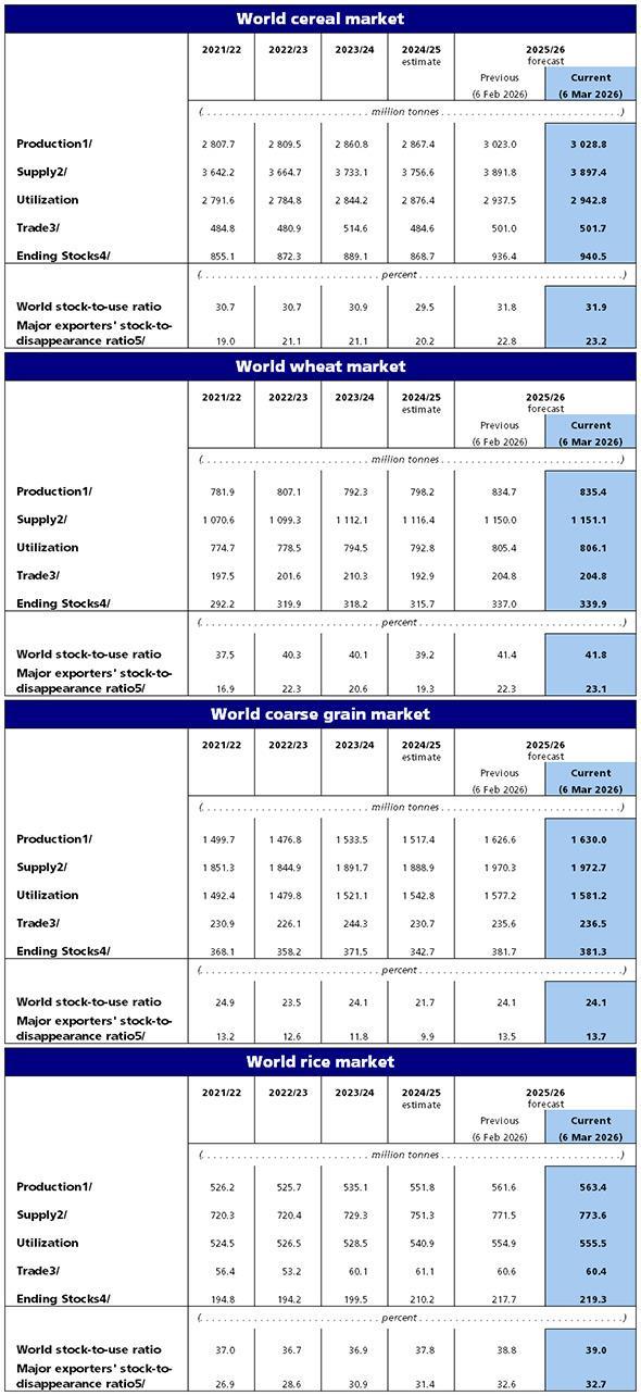 Σύμφωνα με τις τελευταίες εκτιμήσεις του οργανισμού, η παγκόσμια παραγωγή σιταριού αναμένεται να διαμορφωθεί περίπου στους 810 εκατ. τόνους το 2026, καταγράφοντας πτώση σχεδόν 3% σε σχέση με το προηγούμενο έτος, αν και θα παραμείνει πάνω από τον μέσο όρο της τελευταίας πενταετίας.