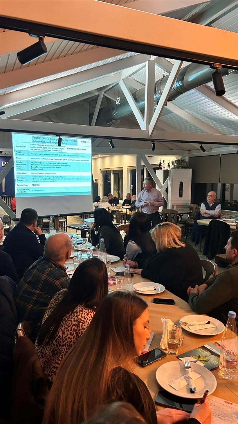 Παράλληλα, παρουσιάστηκε το Forenia®, το νέο βιομυκητοκτόνο της FMC για την αντιμετώπιση ασθενειών εδάφους. Ο Γιώργος Κολιόπουλος, Marketing Specialist South Greece, ανέδειξε τον διπλό ρόλο του προϊόντος, το οποίο συνδυάζει φυτοπροστασία και βιοδιέγερση, εντασσόμενο πλήρως στη φιλοσοφία της ολοκληρωμένης και βιώσιμης διαχείρισης των καλλιεργειών.