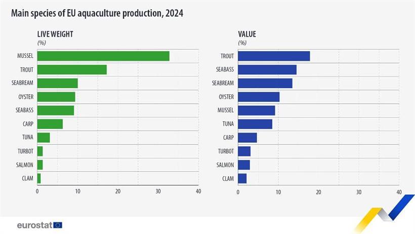 Σε επίπεδο όγκου παραγωγής, τα μύδια κυριαρχούν, αντιπροσωπεύοντας το 32,8% της συνολικής παραγωγής της ΕΕ. Ακολουθούν οι πέστροφες με 17,2% και οι τσιπούρες με 10%.