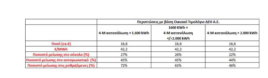 Η έκπτωση των 42 ευρώ/MWh αντιστοιχεί σε έκπτωση της τάξης του 27% στο σύνολο του λογαριασμού (ή 45% επί του ανταγωνιστικού τιμολογίου της ΔΕΗ) για καταναλώσεις έως 1.600 KWh το τετράμηνο, που είναι η κατανάλωση ενός μέσου νοικοκυριού.
