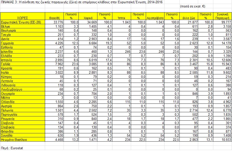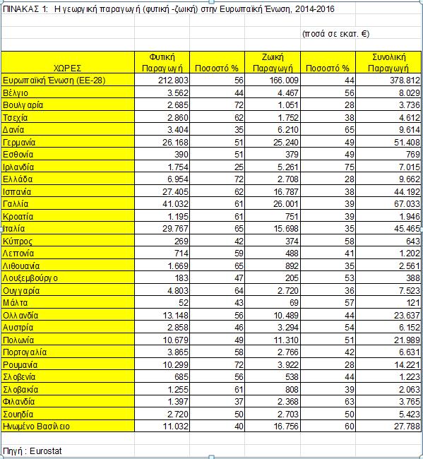 Αναφορικά με τη χώρα μας, η Ελλάδα όπως και οι άλλες Μεσογειακές χώρες, υπερέχει στη φυτική παραγωγή η οποία είναι 2,5 περίπου φορές μεγαλύτερη σε αξία από τη ζωική, έχει σημαντικά μερίδια παραγωγής στα φρούτα (7,5%) και το ελαιόλαδο (17,4%) αλλά πολύ μικρή συμμετοχή στη ζωική παραγωγή στην ΕΕ-28.