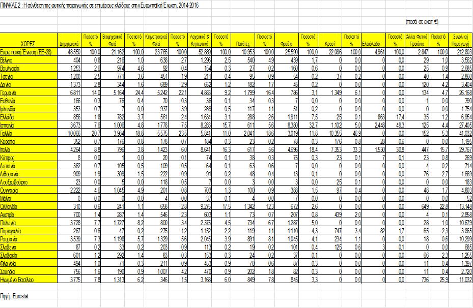 Η Ισπανία, η Ιταλία και η Ελλάδα είναι οι μεγαλύτεροι παραγωγοί στην ΕΕ-28 στο ελαιόλαδο με ποσοστά 49,9%, 30,8% και 17,4% ενώ η Ολλανδία και η Ιταλία στα άλλα φυτικά προϊόντα με ποσοστά 22,8 % και με 15,7%.