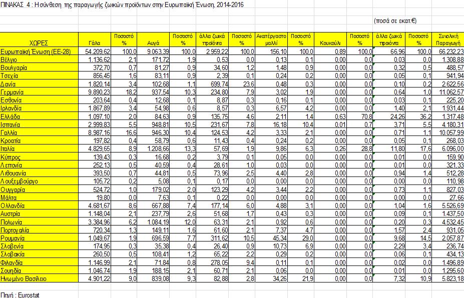 Η αξία των ζωικών προϊόντων ανέρχεται ετησίως στα 66,2 δις. € (Πίνακας 4) εκ των οποίων το γάλα 54,2 δις € (81,8 %), τα αυγά 9 δις. € (13,7 %) και άλλα ζωικά προϊόντα 3 δις. € (4,5 %). Η Γερμανία και η Γαλλία παράγουν την μεγαλύτερη ποσότητα γάλακτος (σε ποσοστά 18,2% και 16,6% αντίστοιχα). Η Ιταλία παράγει το 13,3% της συνολικής παραγωγής αυγών στην ΕΕ-28. Η Πολωνία παράγει το 12,0% ενώ η Γερμανία, η Ισπανία, η Γαλλία και το Ηνωμένο Βασίλειο γύρω στο 10% της συνολικής παραγωγής αυγών.