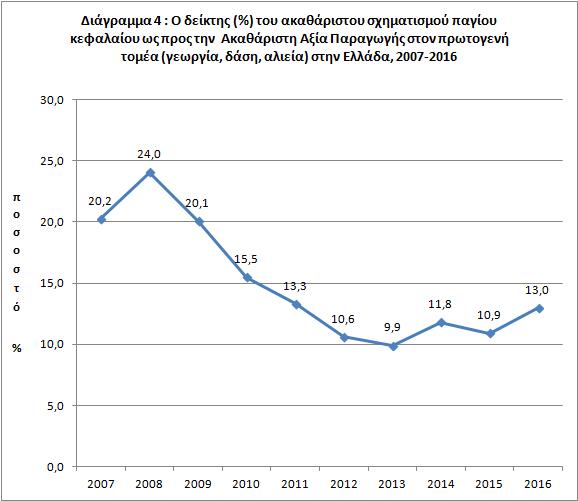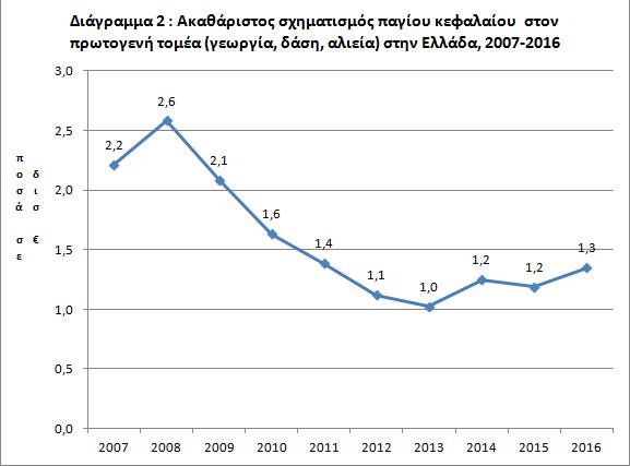 Αναλυτικότερα για τη χώρα μας παρατηρούμε ότι από το 2007 έως το 2008 ο ακαθάριστος σχηματισμός παγίου κεφαλαίου αυξάνεται κατά 17% περίπου, δηλαδή από τα 2,2 δισ. € στα 2,6 δισ. €. Εν συνεχεία μειώνεται συνεχώς από τα 2,6 περίπου δισ. € το 2008 στο 1,0 περίπου δισ. € το 2013 με συνολική μείωση 84% περίπου. Τέλος, από το 2013 έως το 2016 εμφανίζει αύξηση κατά 30% και φθάνει στα 1,3 δισ. € το 2016 περίπου (διάγραμμα 2).